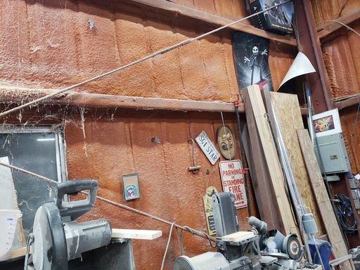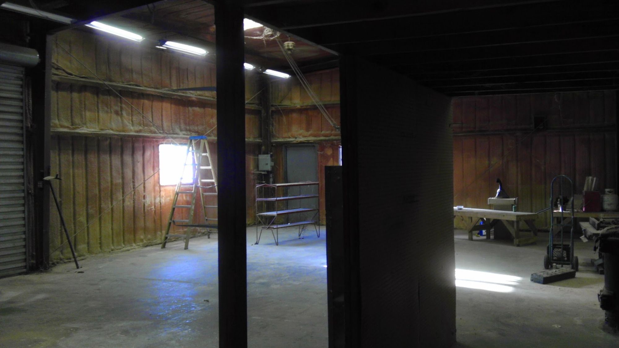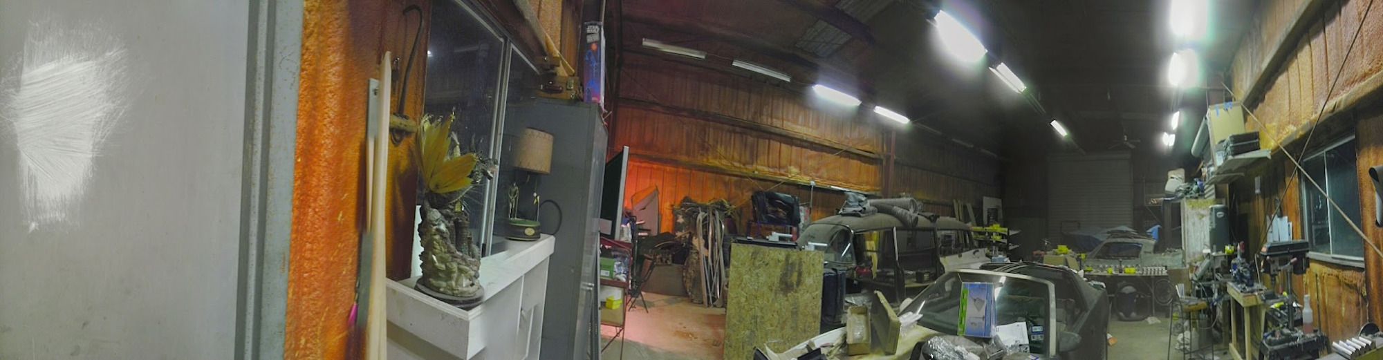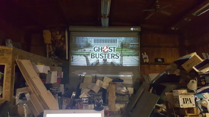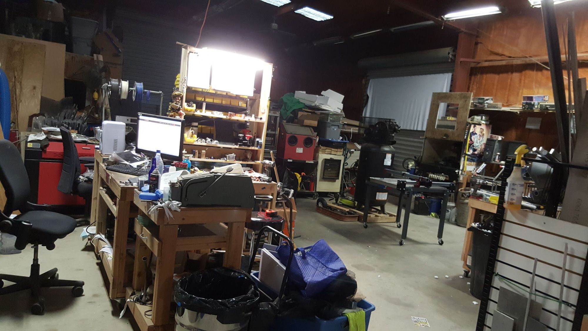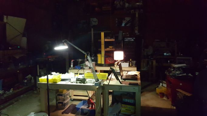 Ahh, yes, the dark. Just enough light to work, and the only reason for it was to project a movie on the large roll-up door. This was the start of my obsession with a projector in the shop. I did go back to a TV for a long time, but if you're gonna spend lots of nights in the workshop, what better way to do it than with a huge screen?