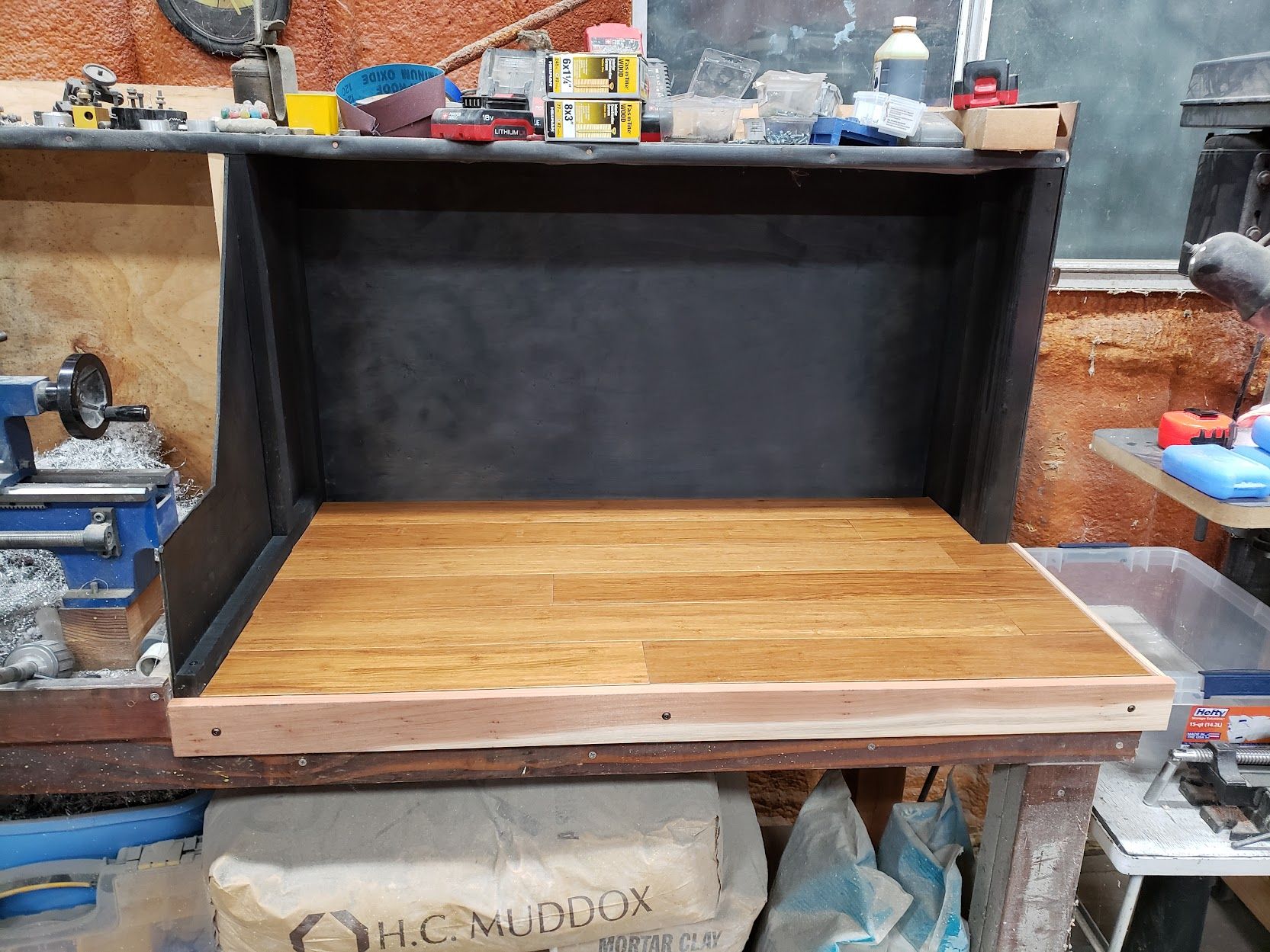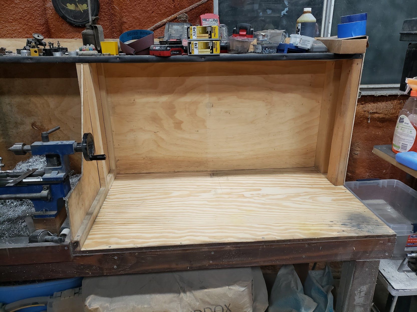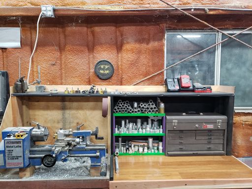 The Lathe Station is a mess yet again, but over the years, it’s definitely earned enough XP to level up a bit. It got a nicer top, some color, and a major functional upgrade: a recessed back that lets the toolbox sit all the way against the wall and still open the top lid. That’s a pure, satisfying XP gain in workshop efficiency.
