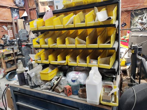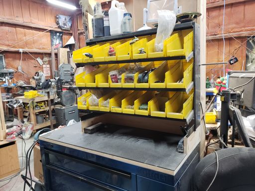 This station has kinda been a headache over the years. I got the toolbox for a great price—I wanna say it was like $50.00 brand new—then I added a wood top and bolted on a Harbor Freight bin rack. I really thought this was for me... nope, still not my style of organization. It just could not contain my chaos.